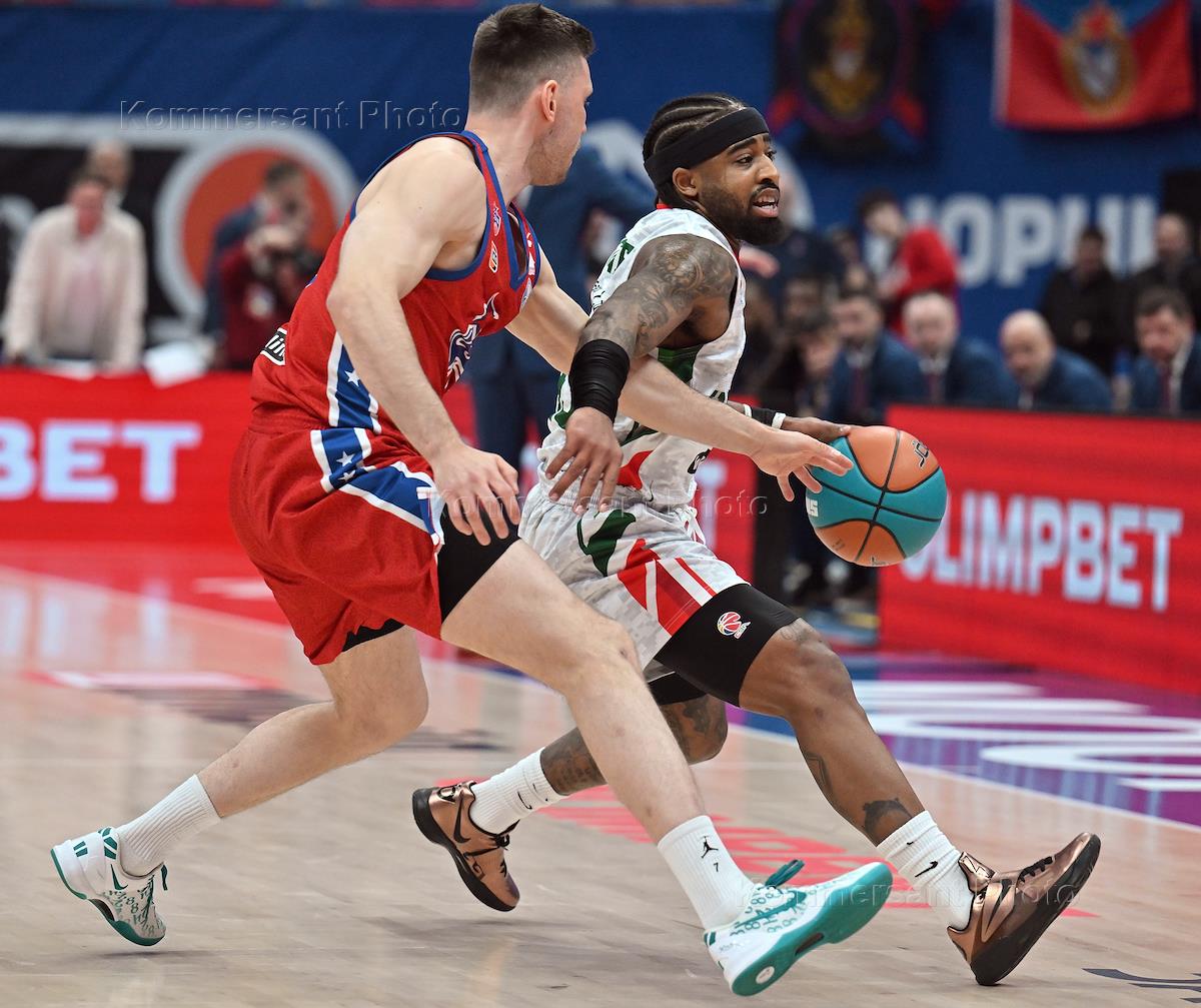 Единая лига ВТБ по баскетболу. Полуфинал. Матч между командами ЦСКА (Москва) - УНИКС (Казань) на стадионе "Мегаспорт". Игрок команды УНИКС Джален Рейнольдс (слева) и игрок команды ЦСКА Антон Астапкович (справа) во время матча.