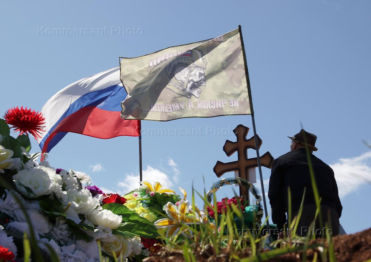 Торжественное открытие мемориала в память участников Великой Отечественной войны и мемориала в память участников специальной военной операции (СВО) в рамках проекта Международного Демидовского фонда "История. Связь времен" в поселке Староуткинск. Жанровая фотография. Флаги и кресты на кладбище.