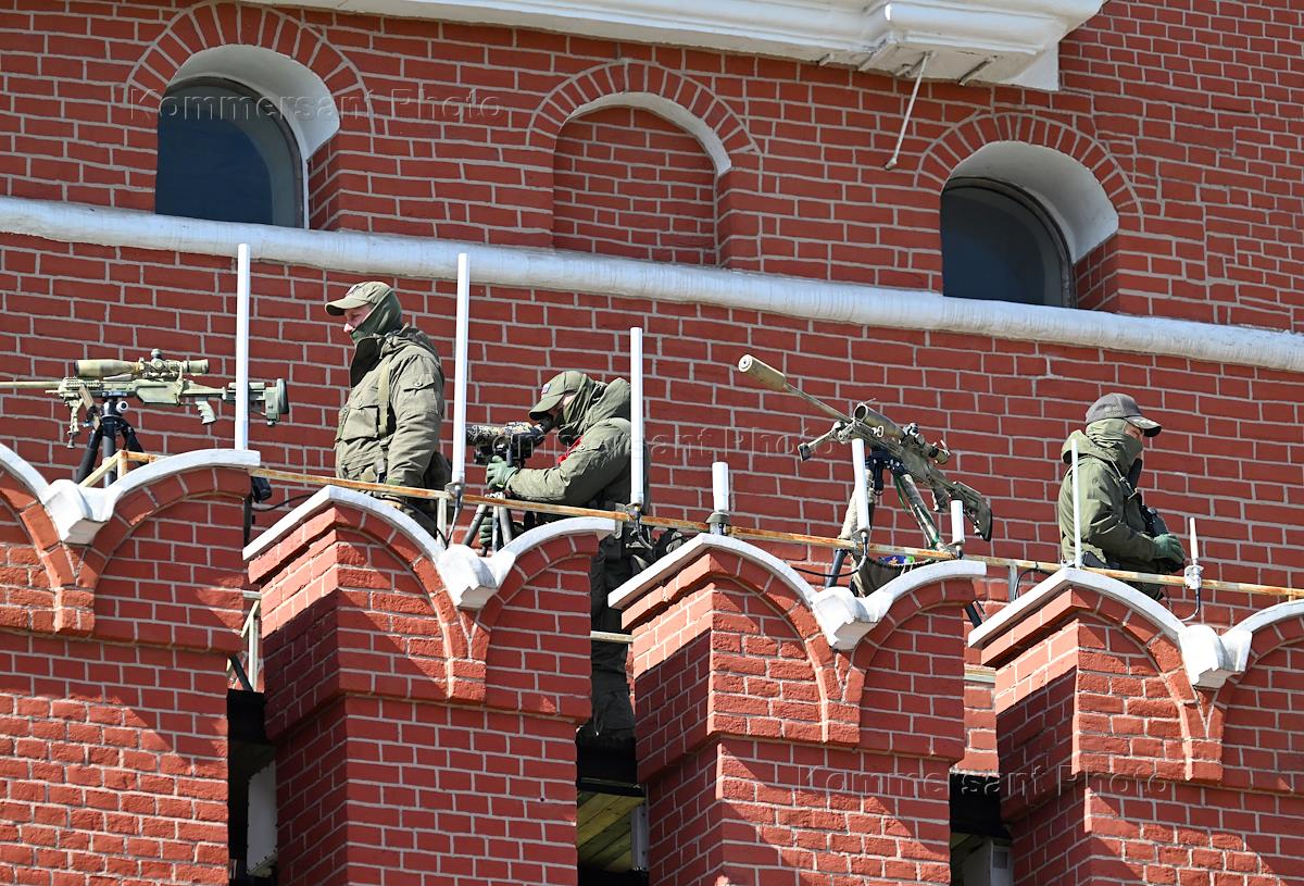 Военный парад на Красной площади, посвященный 80-ой годовщине Победы в Великой Отечественной войне. Жанровая фотография. Снайперы на Спасской башне Кремля во время парада.
