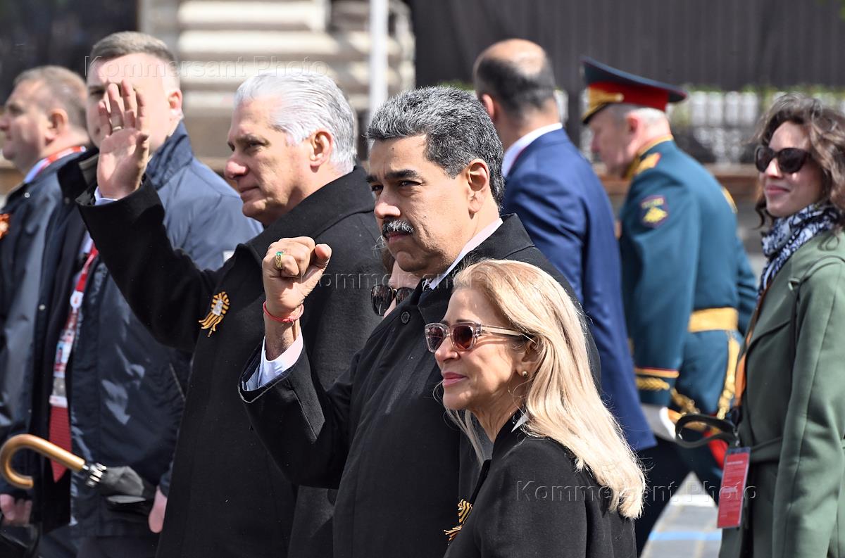 Военный парад, посвященный 80-ой годовщине Победы в Великой Отечественной войне, на Красной площади. Президент Венесуэлы Николас Мадуро (в центре) с супругой Силией Флорес (справа) и президент Кубы Мигель Диас-Канель (слева) после парада.