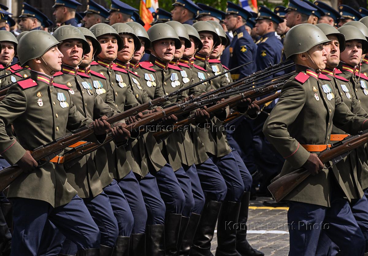 Военный парад, посвященный 80-й годовщине Победы в Великой Отечественной войне, на площади Красной площади. Военнослужащие в парадных расчетах во время парада.
