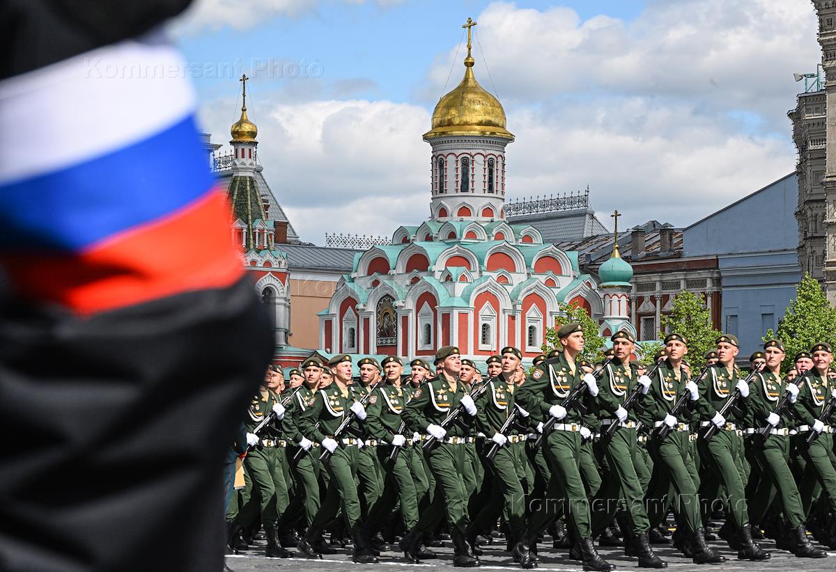 Военный парад, посвященный 80-й годовщине Победы в Великой Отечественной войне, на площади Красной площади. Военнослужащие в парадных расчетах во время парада.