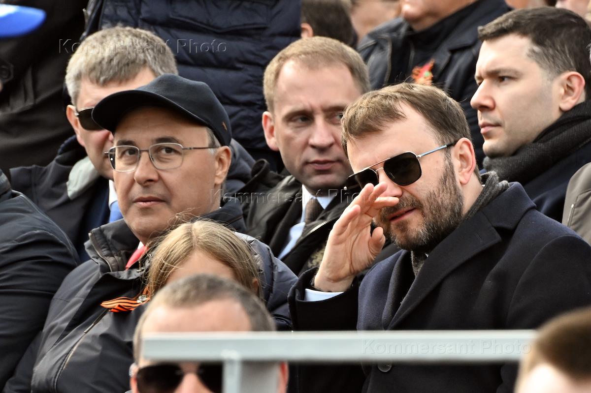 Военный парад на Красной площади, посвященный 80-ой годовщине Победы в Великой Отечественной войне. Генеральный директор Студии "ВоенФильм" Игорь Угольников (слева) и председатель СТД России, художественный руководитель Московского театра Олега Табакова, директор театра "Современник", актер, режиссер Владимир Машков (в центре) на трибуне во время парада.