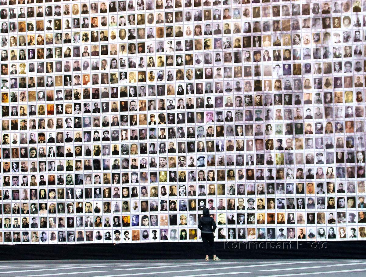 Военный парад, посвященный 80-й годовщине Победы в Великой Отечественной войне, на Дворцовой площади. Жанровая фотография. Баннер с портретами участников Великой Отечественной войны.
