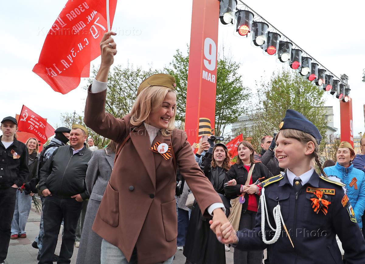 Празднование 80-й годовщины Победы в Великой Отечественной войне в Москве. Жанровая фотография. Участники праздничных мероприятий на улицах города.