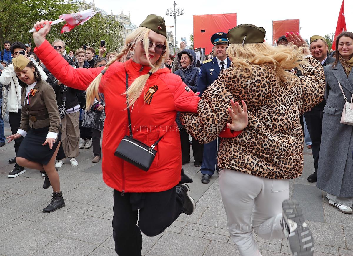 Празднование 80-й годовщины Победы в Великой Отечественной войне в Москве. Жанровая фотография. Участники праздничных мероприятий на Никольской улице.
