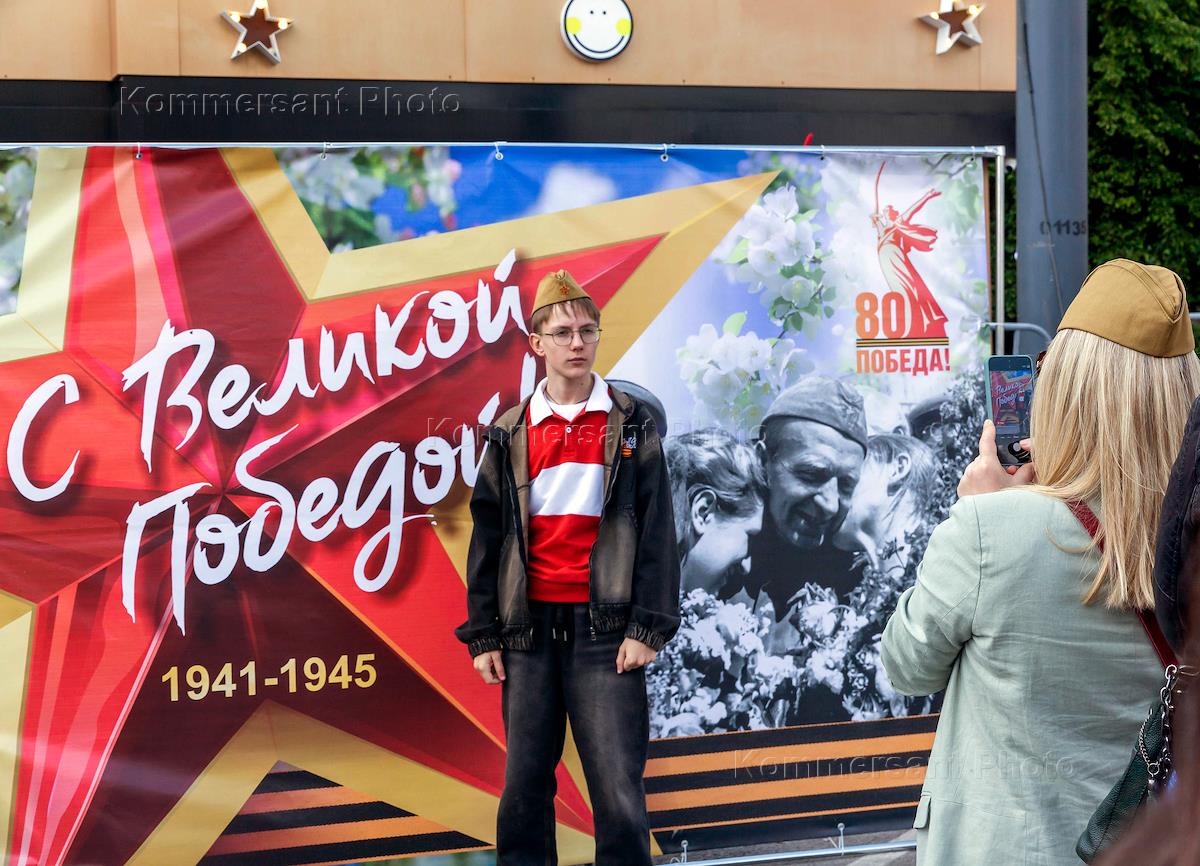 Празднование 80-й годовщины Победы в Великой Отечественной войне в Воронеже. Жанровая фотография. Участники праздничных мероприятий на улицах города.