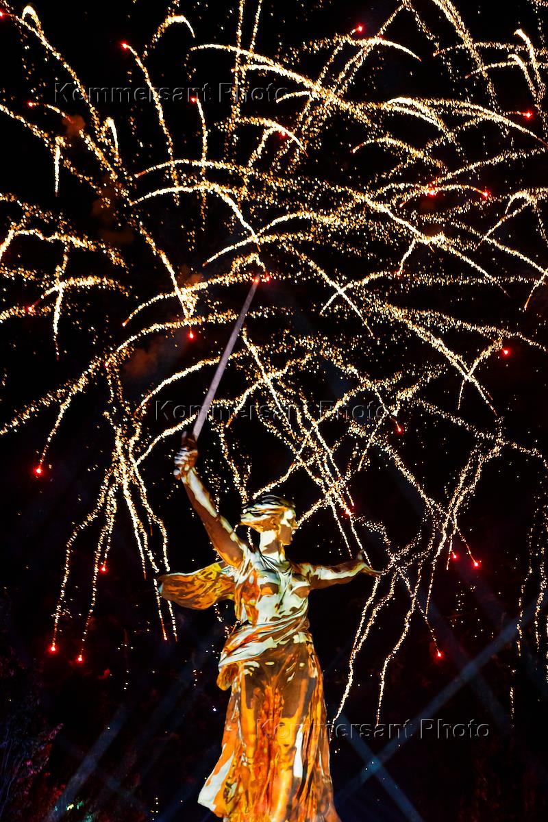 Празднование 80-летия Победы в Великой Отечественной войне. Акция "Свет Великой Победы" на территории мемориального комплекса "Героям Сталинградской битвы" на Мамаевом кургане. Световые проекции лазерного шоу на главном монументе мемориального комплекса "Родина-мать зовет!" и праздничный салют.