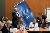 Всероссийский координационный совет уполномоченных по правам человека. Работа секции "Социальная адаптация ветеранов специальной военной операции" на площадке Областного центра реабилитации инвалидов. Министр социальной политики Свердловской области Андрей Злоказов (пятый справа) перед началом заседания.