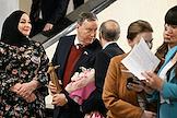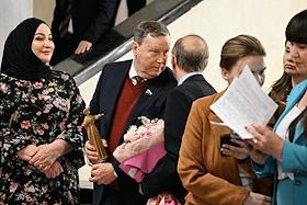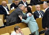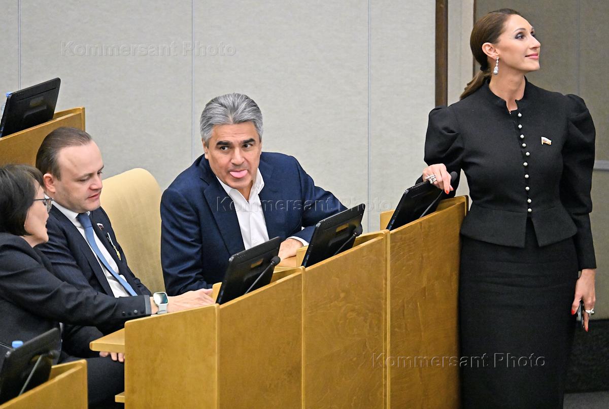 Пленарное заседание Государственной думы (ГД) России. Первый заместитель председателя комитета ГД России по аграрным вопросам Олег Нилов (второй слева) и певица Макка Межиева (слева) перед началом заседания.