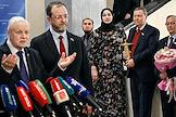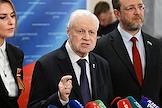 Пленарное заседание Государственной думы (ГД) России. Председатель партии "Справедливая Россия – За Правду", руководитель фракции "Справедливая Россия – За Правду" в Государственной думе (ГД) России Сергей Миронов (слева), заместитель руководителя фракции "Справедливая Россия- За правду" в ГД России Андрей Кузнецов (второй слева), певица Макка Межиева (третья справа), первый заместитель председателя комитета ГД России по аграрным вопросам Олег Нилов (второй справа) и первый заместитель председателя комитета ГД России по развитию гражданского общества, вопросам общественных и религиозных объединений Николай Бурляев (справа) перед началом заседания.