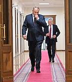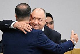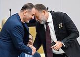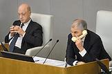 Пленарное заседание Государственной думы (ГД) России. Заместитель председателя ГД России Петр Толстой (слева) и глава комитета ГД России по безопасности и противодействию коррупции Василий Пискарев (справа) перед началом заседания.