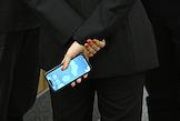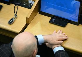 Пленарное заседание Государственной думы (ГД) России. Жанровая фотография. Мобильный телефон. Время на экране телефона.