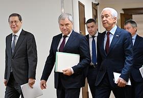 Пленарное заседание Государственной думы (ГД) России. Слева направо: первый заместитель председателя ГД России Александр Жуков, председатель ГД России Вячеслав Володин и руководитель фракции "Единая Россия" в ГД России Владимир Васильев перед началом заседания.