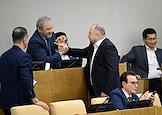 Пленарное заседание Государственной думы (ГД) России. Председатель комитета ГД России по финансовому рынку Анатолий Аксаков (в центре) во время заседания.