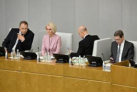 Пленарное заседание Государственной думы (ГД) России. Слева направо: заместитель председателя комитета ГД России по вопросам собственности, земельным и имущественным отношениям Николай Николаев, член комитета ГД России по обороне Виктор Заварзин, заместитель председателя комитета ГД России по туризму и развитию туристической инфраструктуры Наталья Костенко, заместитель председателя комитета ГД России по охране здоровья Евгений Нифантьев и член комиссии ГД России по Регламенту и обеспечению деятельности ГД России Иван Демченко во время заседания.