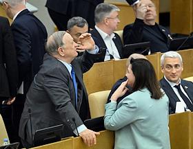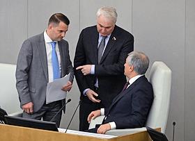 Пленарное заседание Государственной думы (ГД) России. Слева направо: председатель комитета ГД по труду, социальной политике и делам ветеранов Ярослав Нилов, председатель комитета ГД России по обороне Андрей Картаполов и председатель ГД России Вячеслав Володин во время заседания.