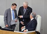 Пленарное заседание Государственной думы (ГД) России. Слева направо: председатель Либерально-демократической партии России (ЛДПР), руководитель фракции ЛДПР в ГД России Леонид Слуцкий, председатель комитета ГД России по обороне Андрей Картаполов и председатель комитета ГД России по труду, социальной политике и делам ветеранов Ярослав Нилов во время заседания.