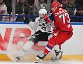 Фонбет - Континентальная хоккейная лига (КХЛ). Чемпионат сезона 2024/25. Финал. Игра первая. Матч между командами "Локомотив" (Ярославль) - "Трактор" (Челябинск) на стадионе "Арена 2000". Игрок команды "Трактор" Семен Дер-Аргучинцев (слева) и игрок команды "Локомотив" Никита Черепанов (справа) во время матча.