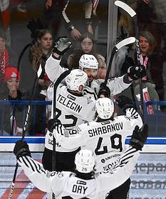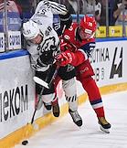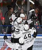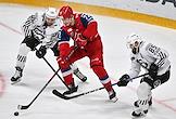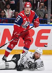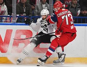 Фонбет - Континентальная хоккейная лига (КХЛ). Чемпионат сезона 2024/25. Финал. Игра первая. Матч между командами "Локомотив" (Ярославль) - "Трактор" (Челябинск) на стадионе "Арена 2000". Игрок команды "Трактор" Максим Шабанов (в центре) и игрок команды "Локомотив" Мартин Гернат (справа) во время матча.