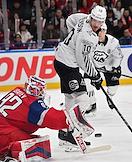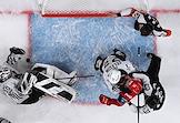 Фонбет - Континентальная хоккейная лига (КХЛ). Чемпионат сезона 2024/25. Финал. Игра первая. Матч между командами "Локомотив" (Ярославль) - "Трактор" (Челябинск) на стадионе "Арена 2000". Вратарь команды "Локомотив" Даниил Исаев (слева) и игрок команды "Трактор" Чарльз Робинсон (справа) во время матча.
