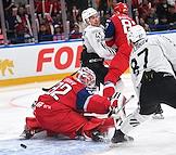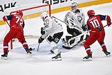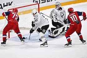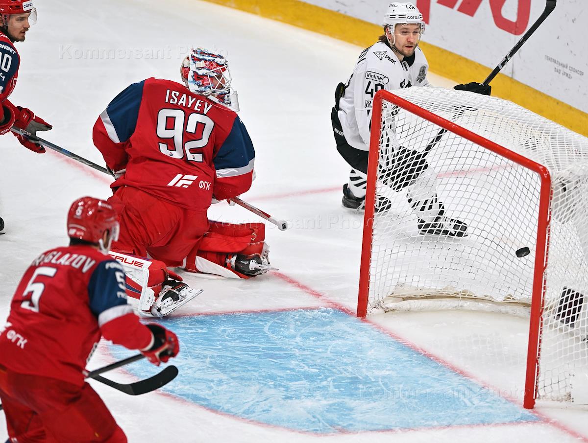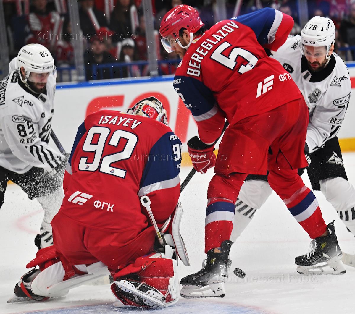 Фонбет - Континентальная хоккейная лига (КХЛ). Чемпионат сезона 2024/25. Финал. Игра первая. Матч между командами "Локомотив" (Ярославль) - "Трактор" (Челябинск) на стадионе "Арена 2000". Вратарь команды "Локомотив" Даниил Исаев (слева) и игрок команды "Локомотив" Алексей Береглазов (второй слева) во время матча.