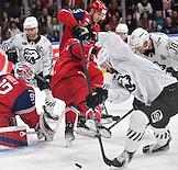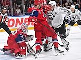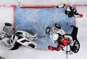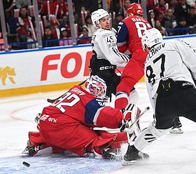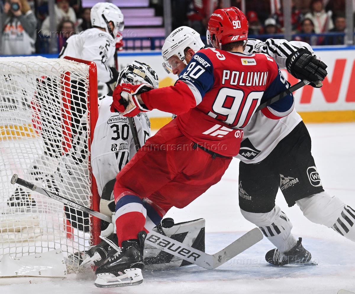 Фонбет - Континентальная хоккейная лига (КХЛ). Чемпионат сезона 2024/25. Финал. Игра первая. Матч между командами "Локомотив" (Ярославль) - "Трактор" (Челябинск) на стадионе "Арена 2000". Слева направо: игрок команды "Трактор" Семен Дер-Аргучинцев, вратарь команды "Локомотив" Даниил Исаев, игрок команды "Локомотив" Алексей Береглазов и игрок команды "Трактор" Александр Кадейкин во время матча.