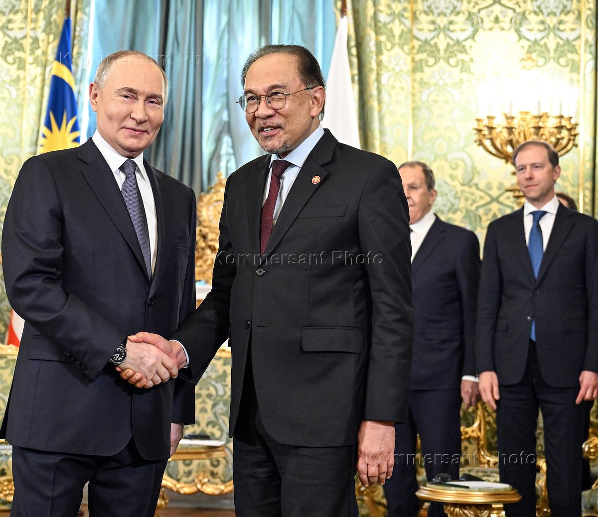 Встреча президента России Владимира Путина и премьер-министра Малайзии Анвара Ибрагима в Кремле. Слева направо: премьер-министр Малайзии Анвар Ибрагим, президент России Владимир Путин и министр иностранных дел России Сергей Лавров во время встречи.