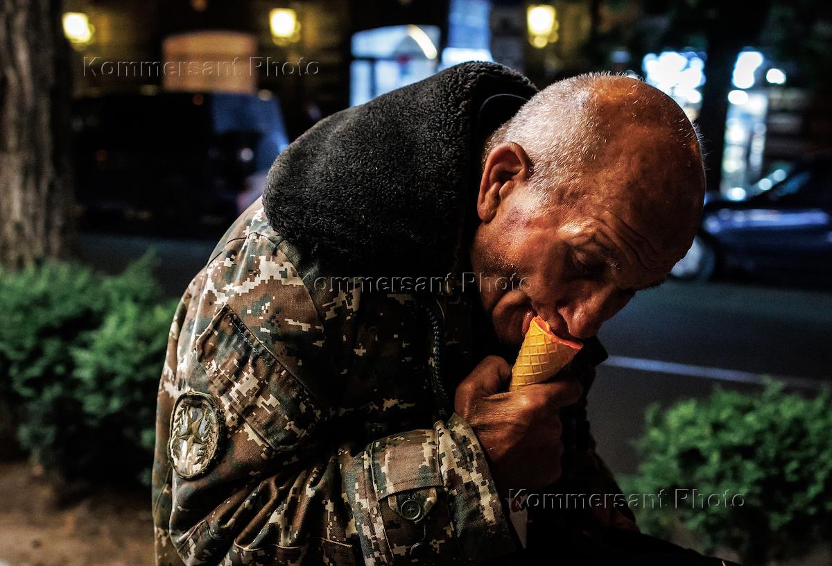 Виды Еревана. Жанровая фотография. Пожилой мужчина ест мороженое на улице.