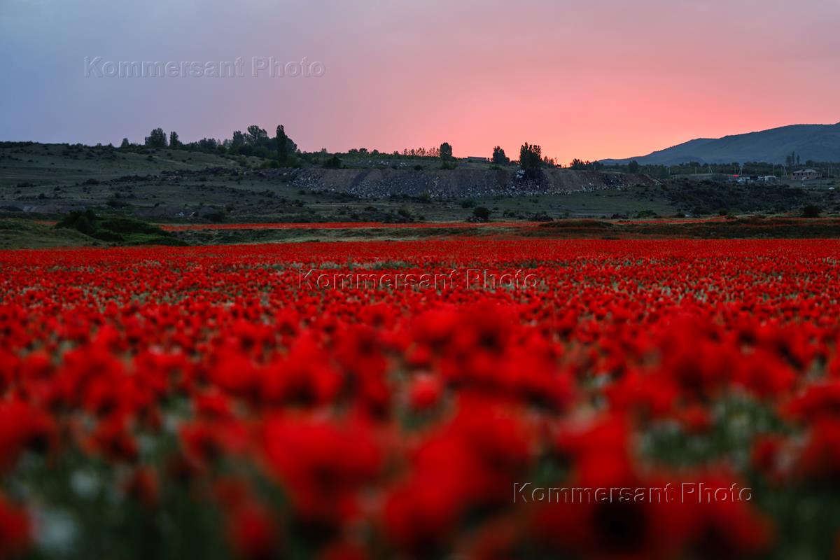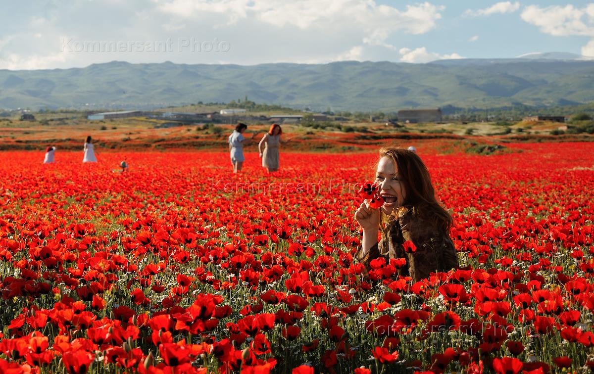 Виды Армении. Цветущие маковые поля на фоне горы Арарат.