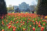 XIII фестиваль тюльпанов, приуроченный к 250-летию со дня рождения архитектора Карла Росси и 300-летию со дня рождения поэта Ивана Елагина, в Центральном парке культуры и отдыха (ЦПКиО) имени С.М.Кирова на Елагином острове. Жанровая фотография. Тюльпаны на фоне здания Елагиноостровского дворца-музея.