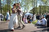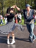 XIII фестиваль тюльпанов, приуроченный к 250-летию со дня рождения архитектора Карла Росси и 300-летию со дня рождения поэта Ивана Елагина, в Центральном парке культуры и отдыха (ЦПКиО) имени С.М.Кирова на Елагином острове. Жанровая фотография. Посетители на танцевальной площадке.