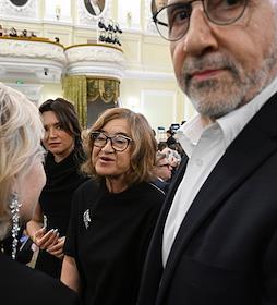Премьера симфонии Nicole в исполнении оркестра musicAeterna под руководством дирижера Теодора Курентзиса в Московской государственной консерватории имени П.И. Чайковского. Директор Государственного музея изобразительных искусств имени Пушкина Ольга Галактионова (в центре) перед началом премьеры.