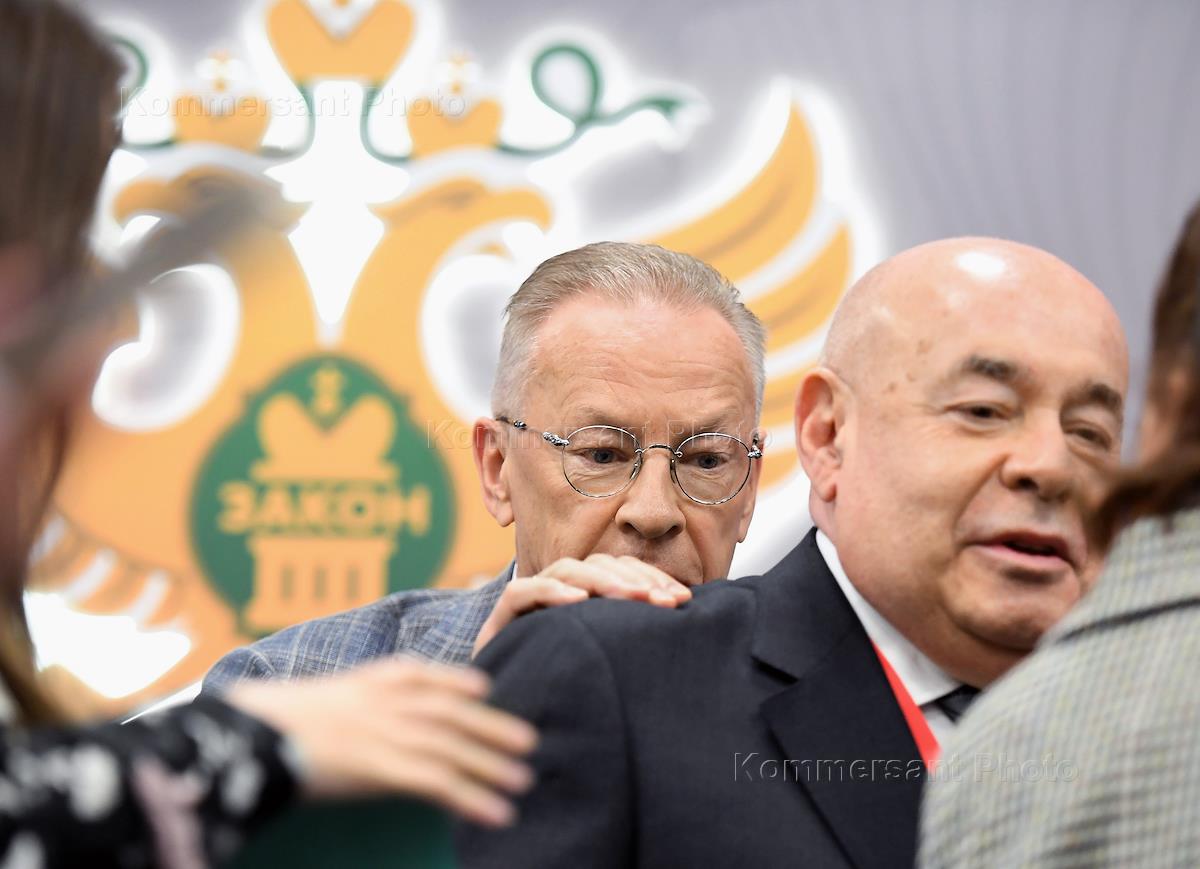 XIII Петербургский международный юридический форум (ПМЮФ) в конгрессно-выставочном центре "Экспофорум". Специальный представитель Президента России по международному культурному сотрудничеству Михаил Швыдкой (справа) и ректор Российского государственного гуманитарного университета (РГГУ) Андрей Логинов (слева) на форуме.