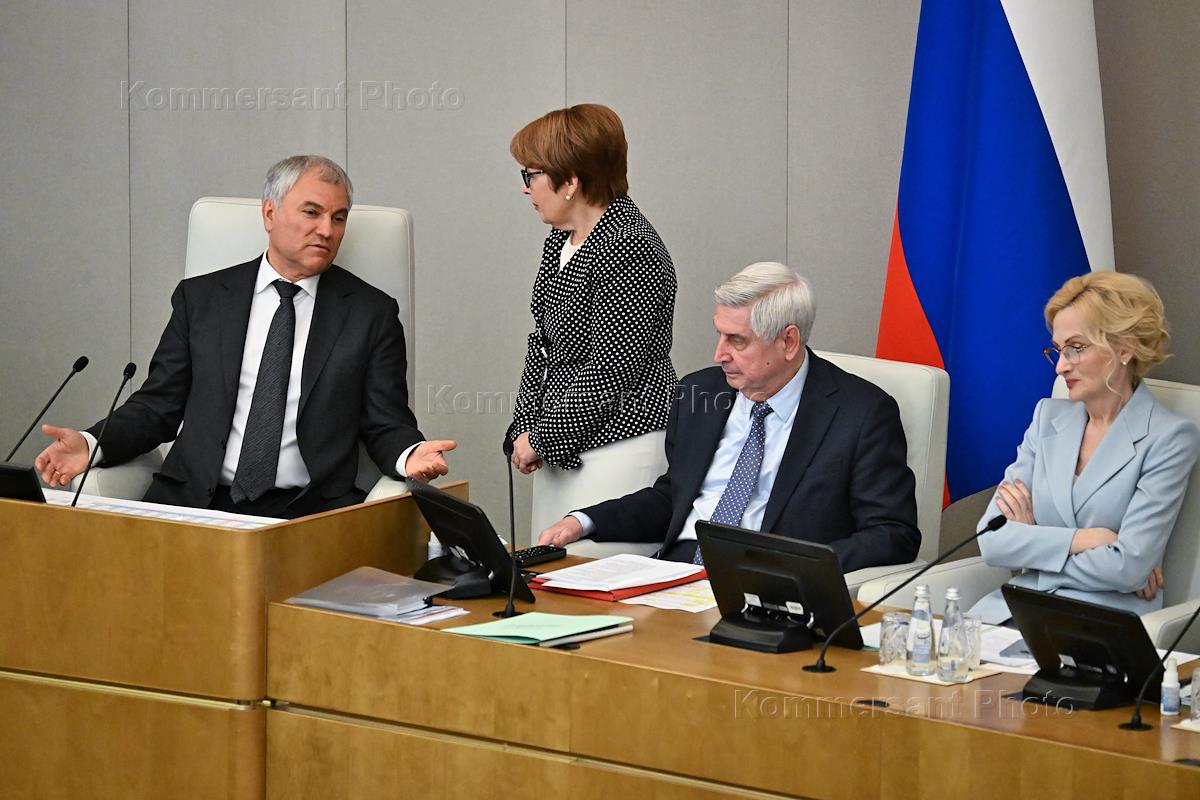 Пленарное заседание Государственной думы (ГД) России. Слева направо: председатель ГД России Вячеслав Володин, член комитета ГД России по бюджету и налогам Оксана Дмитриева, первый заместитель председателя ГД России Иван Мельников и заместитель председателя ГД России Ирина Яровая во время заседания.