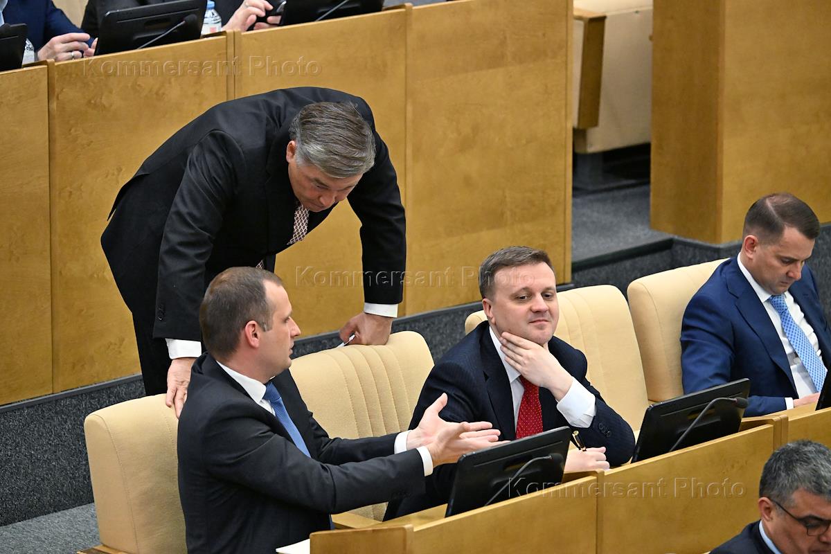 Пленарное заседание Государственной думы (ГД) России. Член комитета ГД по культуре Дмитрий Кузнецов (справа) во время заседания.
