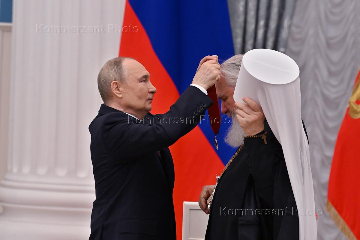 Церемония вручения государственных наград в Екатерининском зале Кремля. Президент России Владимир Путин (слева) и митрополит Калужский и Боровский Климент, награжденный орденом "За заслуги перед Отечеством" II степени, во время церемонии.