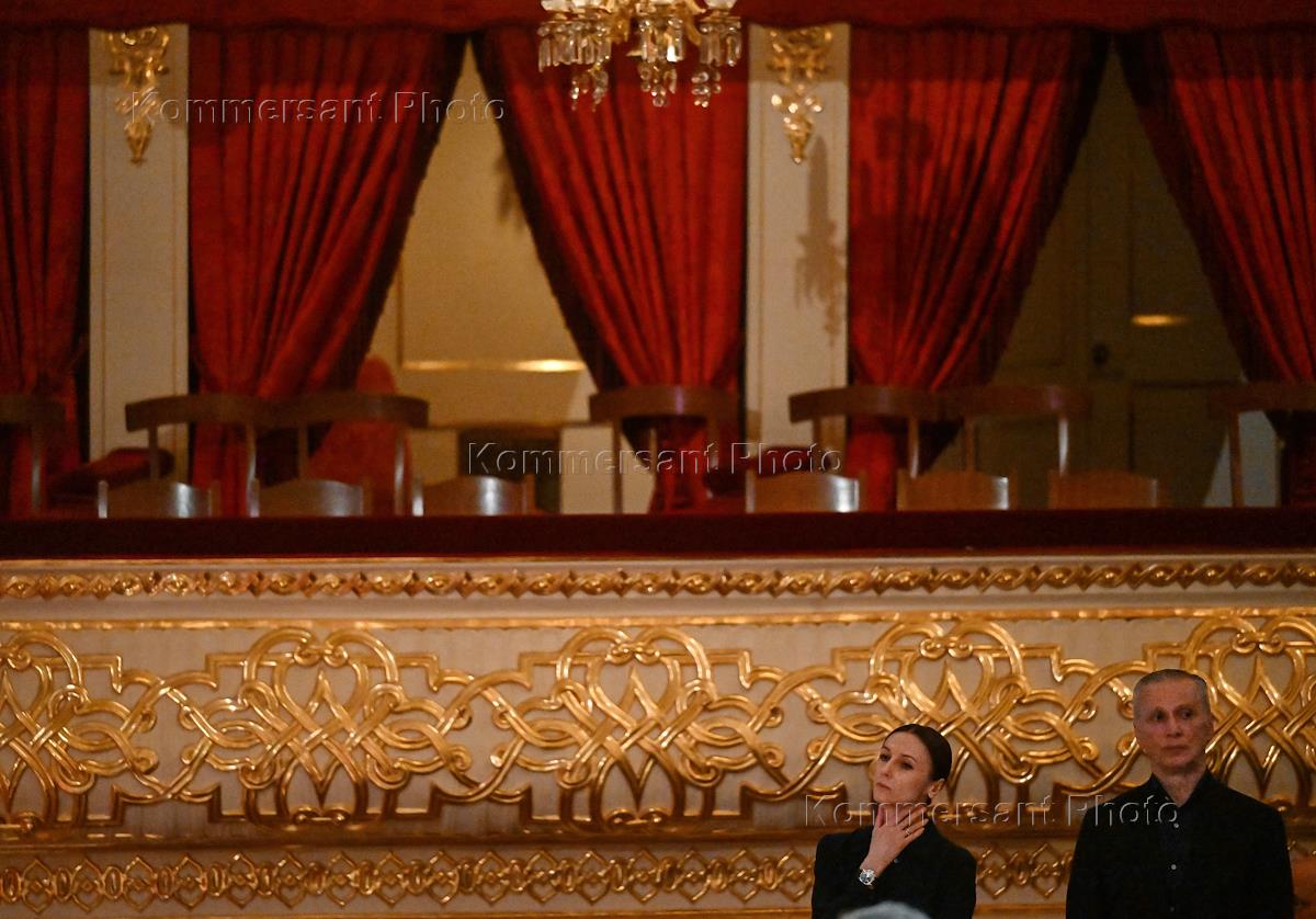 Церемония прощания с балетмейстером Юрием Григоровичем в Государственном академическом Большом театре (ГАБТ). Прима-балерина ГАБТ Светлана Захарова (слева) и художественный руководитель балетной труппы ГАБТ Махар Вазиев (справа) на церемонии.