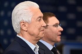 Подведение итогов предварительного голосования по кандидатурам для последующего выдвижения от партии "Единая Россия" кандидатами на выборах в органы государственной власти и органы местного самоуправления. Церемония соединения ключей шифрования в Центральном исполкоме партии "Единая Россия". Руководитель фракции партии "Единая Россия" в Государственной думе России Владимир Васильев (слева) и первый заместитель председателя Совета Федерации России Владимир Якушев (в центре) на церемонии.