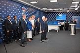 Подведение итогов предварительного голосования по кандидатурам для последующего выдвижения от партии "Единая Россия" кандидатами на выборах в органы государственной власти и органы местного самоуправления. Церемония соединения ключей шифрования в Центральном исполкоме партии "Единая Россия". Представитель в Совете Федерации России от законодательного (представительного) органа государственной власти Новосибирской области Александр Карелин (второй справа), представитель в Совете Федерации (СФ) России от исполнительного органа государственной власти Ленинградской области Сергей Перминов (справа), президент ПАО "Ростелеком" Михаил Осеевский (четвертый справа), заместитель председателя комитета ГД России по развитию гражданского общества, вопросам общественных и религиозных объединений Ольга Занко (вторая слева), руководитель фракции "Единая Россия" в Государственной думе России Владимир Васильев (в центре, слева) и первый заместитель председателя Совета Федерации России Владимир Якушев (в центре, справа) во время церемонии.