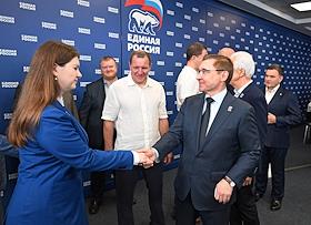 Подведение итогов предварительного голосования по кандидатурам для последующего выдвижения от партии "Единая Россия" кандидатами на выборах в органы государственной власти и органы местного самоуправления. Церемония соединения ключей шифрования в Центральном исполкоме партии "Единая Россия". Первый заместитель председателя Совета Федерации России Владимир Якушев (в центре) и заместитель председателя комитета Государственной думы России по развитию гражданского общества, вопросам общественных и религиозных объединений Ольга Занко (слева) на церемонии.