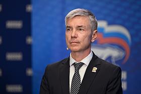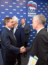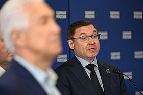 Подведение итогов предварительного голосования по кандидатурам для последующего выдвижения от партии "Единая Россия" кандидатами на выборах в органы государственной власти и органы местного самоуправления. Церемония соединения ключей шифрования в Центральном исполкоме партии "Единая Россия". Заместитель руководителя фракции партии "Единая России" в Государственной думе России Евгений Ревенко на церемонии.