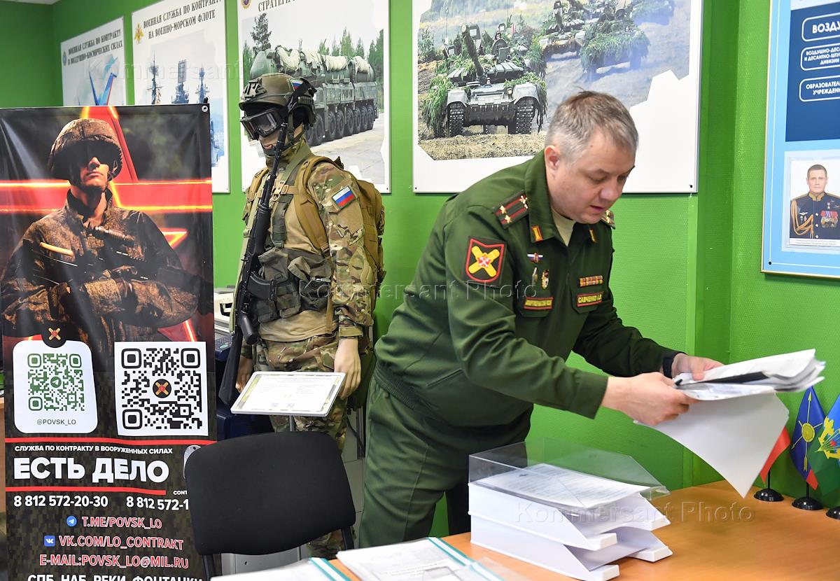 Пункт отбора на военную службу по контракту по Ленинградской области. Военнослужащий во время приема документов.