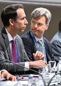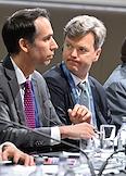 13-я международная встреча высоких представителей, курирующих вопросы безопасности, под председательством Секретаря Совета Безопасности России Сергея Шойгу. Церемония открытия. Статс-секретарь заместитель министра внутренних дел России Игорь Зубов (слева), советник директора Федеральной службы безопасности России Сергей Беседа (второй слева) и заместитель секретаря Совета безопасности России Алексей Шевцов (справа) во время церемонии.