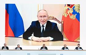 13-я международная встреча высоких представителей, курирующих вопросы безопасности, под председательством Секретаря Совета Безопасности России Сергея Шойгу. Церемония открытия. Президент России Владимир Путин (на экране) во время обращения к участникам встречи.