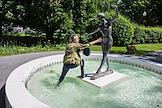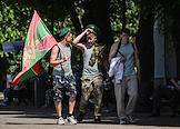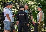 Празднование Дня пограничника. Жанровая фотография. Воины-пограничники и сотрудник полиции во время гуляний в парке имени Горького.
