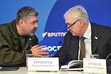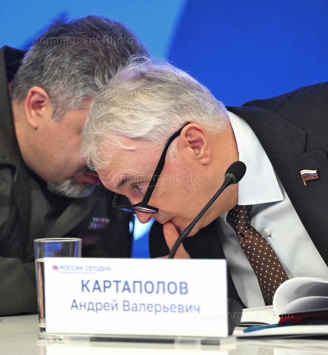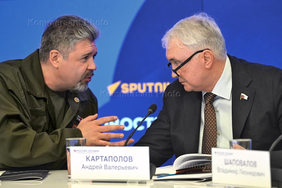 Пресс-конференция на тему "Пытки российских военнослужащих: свидетельства освобожденных из украинского плена" в МИА "Россия сегодня". Председатель Международного общественного трибунала по преступлениям украинских неонацистов, член Общественной палаты России Максим Григорьев (слева) и председатель комитета Государственной думы России по обороне Андрей Картаполов (справа) во время пресс-конференции.