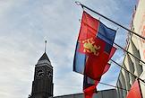 Виды Красноярска. Башня с часами (Красноярский Биг Бэн) и флаги с гербом Красноярска на здании Администрации Красноярска.