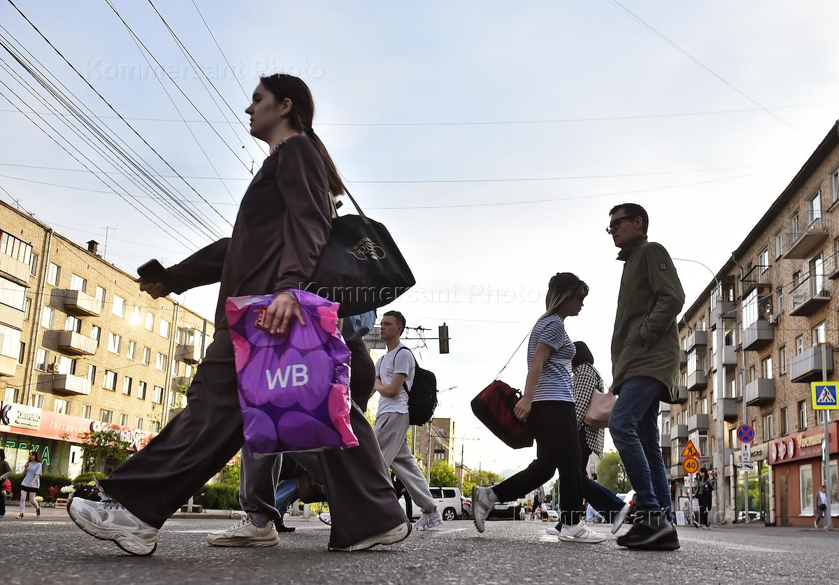 Виды Красноярска. Жанровая фотография. Люди переходят улицу по пешеходному переходу.