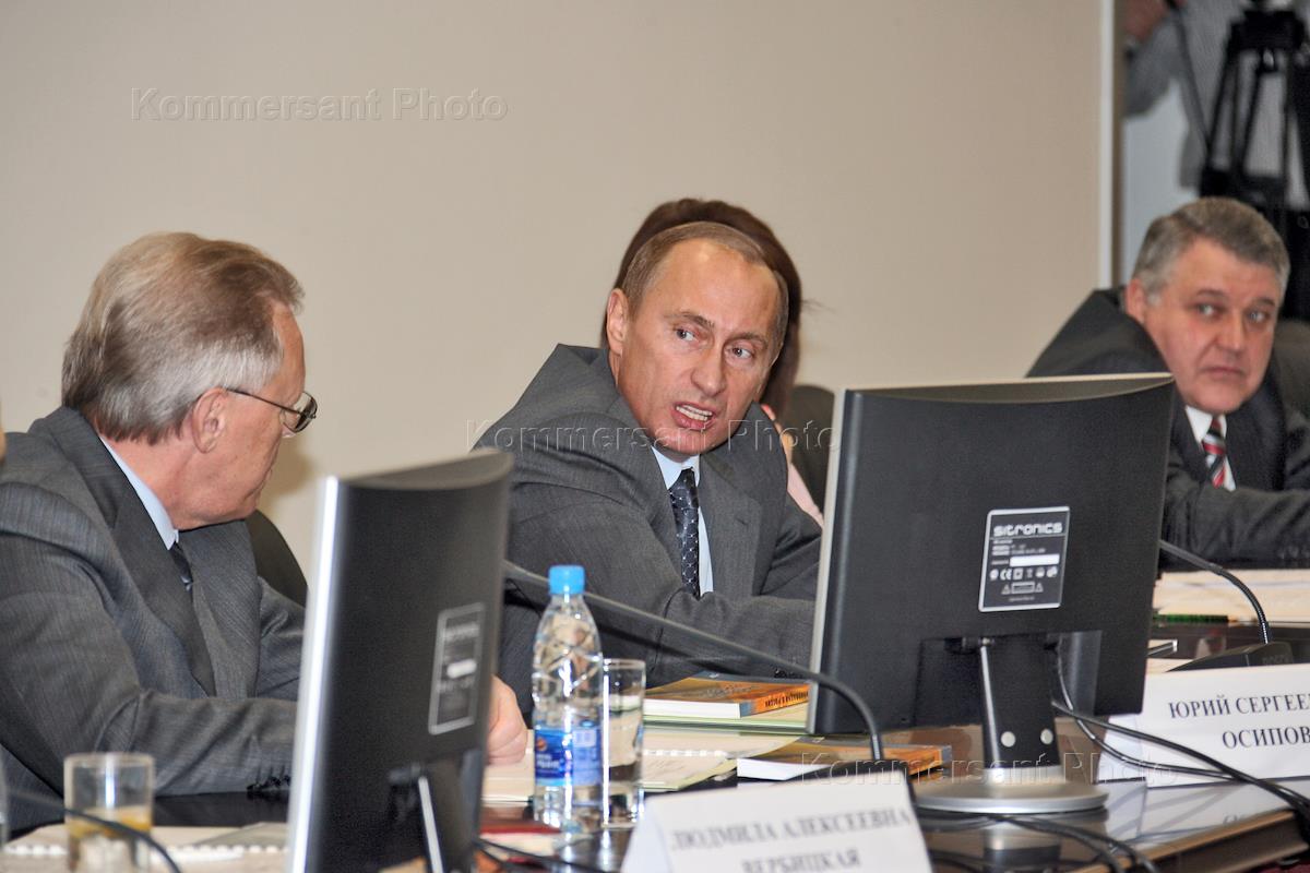 Президент России Владимир Путин (в центре) и президент Российской Академии Наук (РАН) Юрий Осипов (слева) на заседании Совета при Президенте по науке, технологиям и образованию.